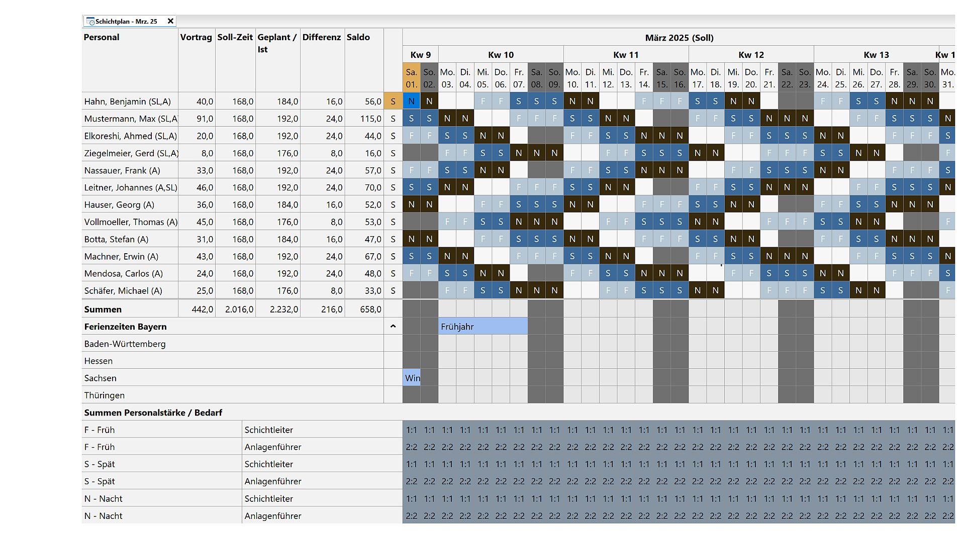Bei der Schichtmodellierung können u.a. Qualifikationen, Arbeitstage, Arbeitszeit und Tarifstunden, gesetzliche Regeln sowie weitere kundenspezifische Wünsche einbezogen werden. Alle personalisierten Daten unterliegen dem Datenschutz (DSGVO) und können standardmäßig anonymisiert ausgewiesen werden.