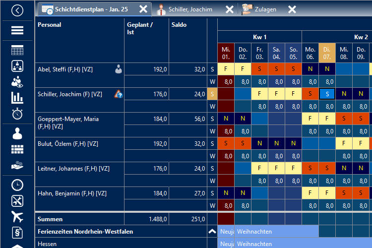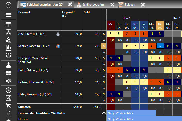 Effiziente Schichtplaner Software mit KI-Unterstützung, Schichtplanung, Konti-Modell-Planung, Urlaubsplanung, Schichtmodell-Erstellung sowie Schichtrhythmen. Das Schichtplaner Programm unterstützt alle Arten der einfachen Schichtplanung sowie auch vorausschauende Schichtpläne mit komplexen Anforderungen und hohen Mitarbeiterzahlen.